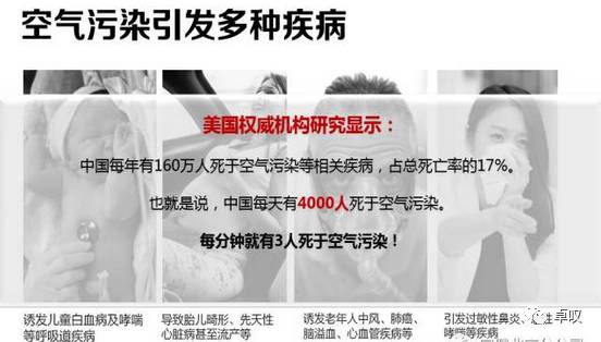 这就不难解释:为什么近年来白血病患儿越来越多,流产、胎儿畸形的现象越来越多,中老年人患心脑血管疾病人群越来越多,亚健康人群越来越多的原因了。同时美国权威机构研究显示:中国每天有4000人死于空气污染,每分钟就有3人死于空气污染!
